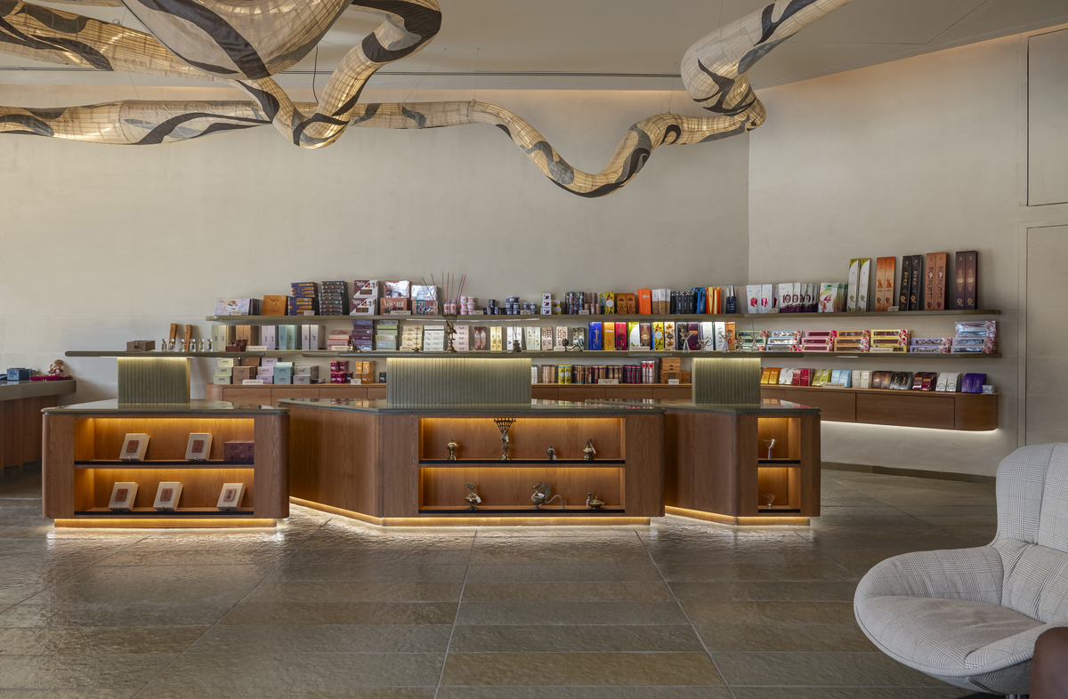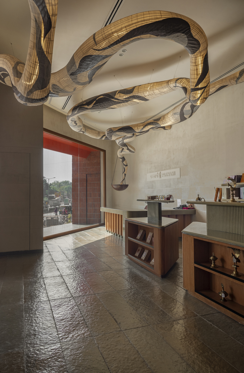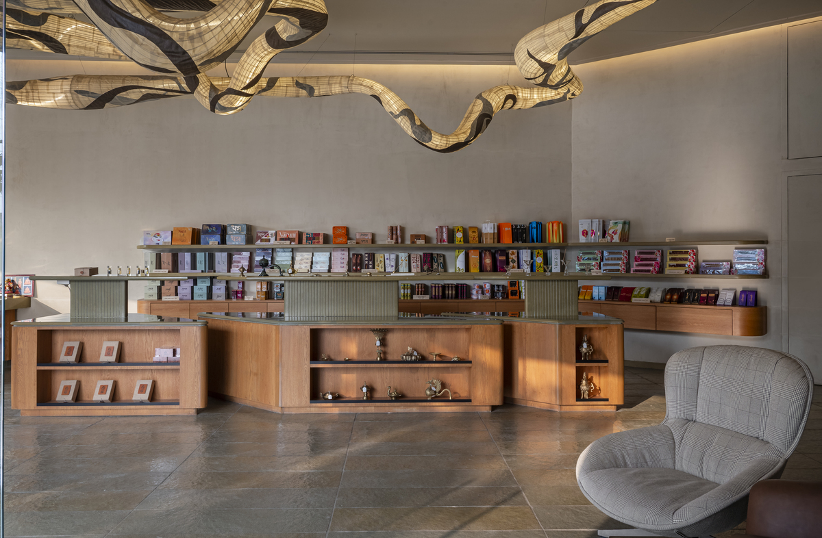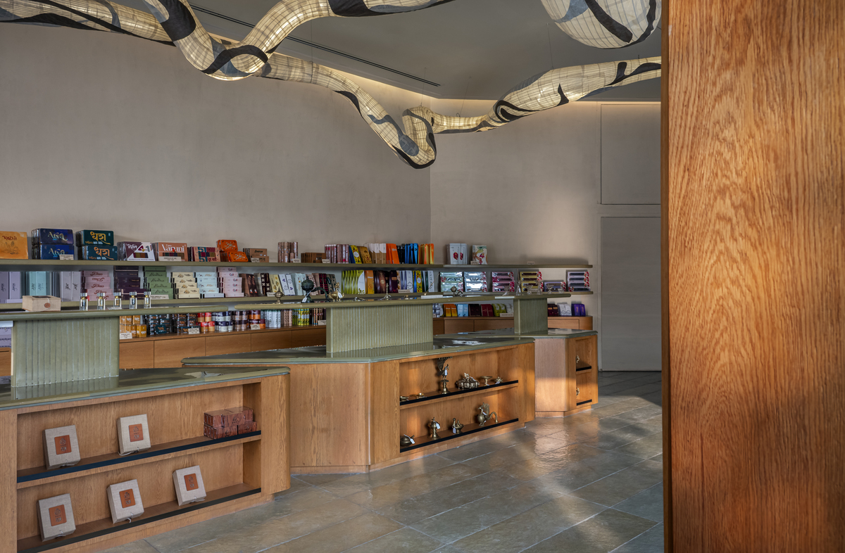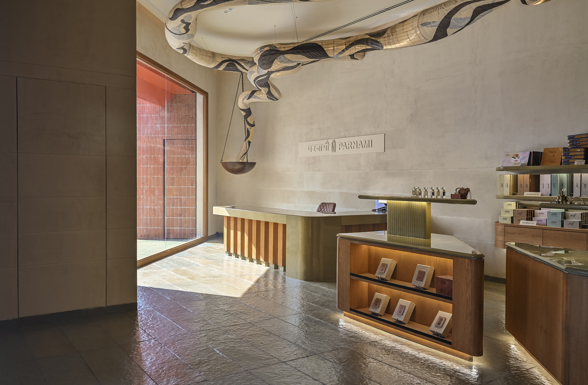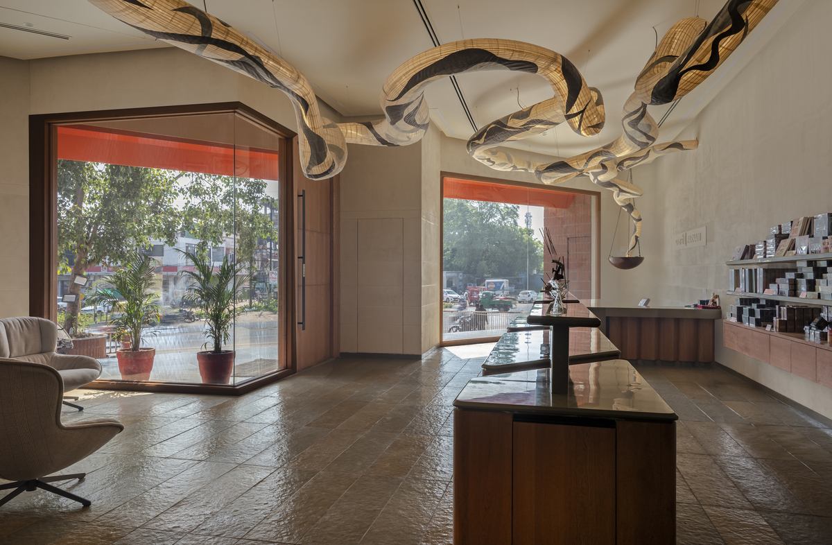 The Parnami Incense Sticks Store in Vadodara reimagines incense retail as a serene, sensorial gallery where architecture enhances ritual and experience. Designed within a challenging triangular site, the Parnami Incense Sticks Store transforms geometry into a defining spatial language, most evident in its bold triangular entrance that guides visitors inward. Inside the Parnami Incense Sticks Store, open circulation and low-profile displays maintain visual clarity while allowing products to remain central to the experience. An earthy, monochromatic material palette of Kota stone, oak veneer, and textured walls gives the Parnami Incense Sticks Store a calm, grounded character. Concealed services and soft indirect lighting reinforce visual purity, while a sculptural light inspired by incense smoke becomes the symbolic heart of the Parnami Incense Sticks Store, connecting space, product, and ritual into a cohesive architectural narrative.
